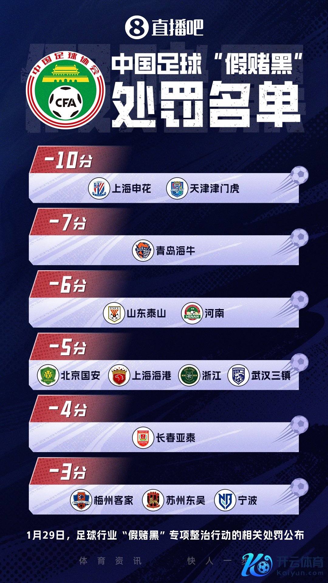 01月30日讯 昨日上昼,足球行业“假赌黑”专项整治行为的有关会议在北京召开。中午12点摆布,足协公布惩处,13家行状俱乐部被罚分,其中中超9队,申花、津门虎被罚10分。