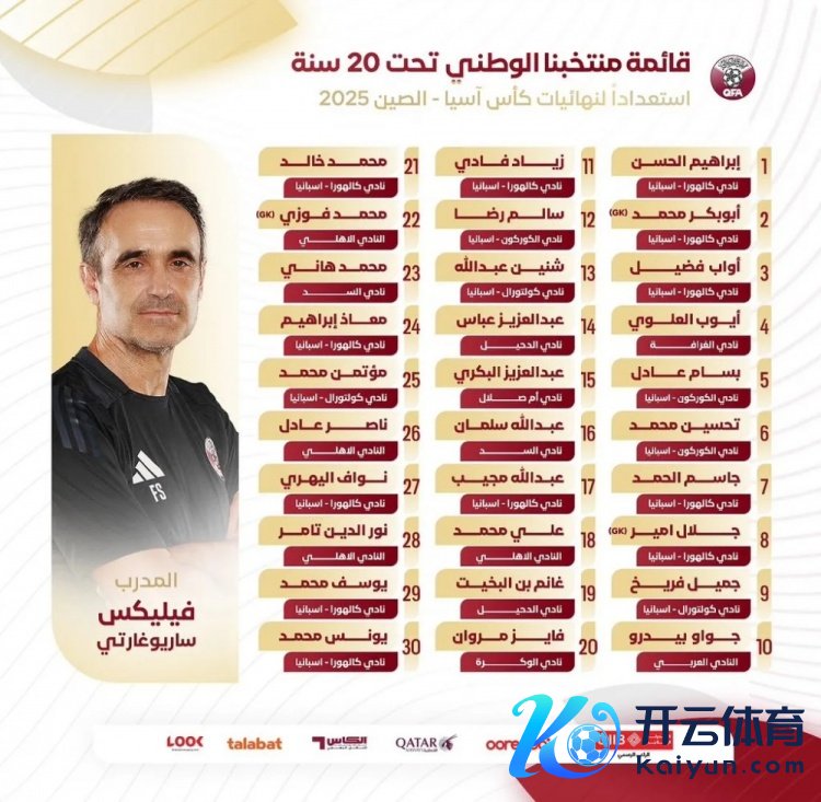 U20亚洲杯小组赛,国青队首个敌手卡塔尔国青队,西班牙主帅萨利乌加特昨年7月才上任。昨年9月预选赛3场全胜零失球出线,1月3日刚刚公布备战U20亚洲杯的30东谈主集训名单。其中多达16东谈主在西班牙初级别球队留洋。第4级别的卡拉奥拉就有多达12东谈主,第3级别的阿尔科孔3东谈主,莱昂内萨1东谈主。不外,他们齐是在各自俱乐部的梯队踢球。其中门将奥斯曼、中卫阿布达拉、边卫莫塔曼、前腰队长哈桑(苏丹裔)、后腰巴萨姆、边锋古达(埃及裔)、塔辛(印度裔)、中场弗里亚克(阿尔及利亚裔)、若奥-佩德罗(巴西裔)等主力或瓜代球员齐是归化球员,除了若奥-佩德罗,其余归化球员齐在西班牙留洋。