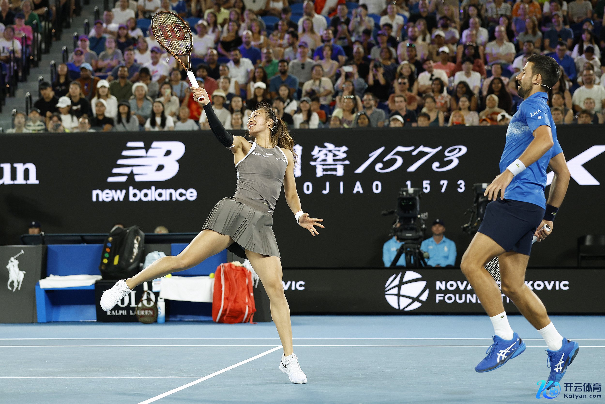 郑钦文(左)和德约科维奇在比赛中。