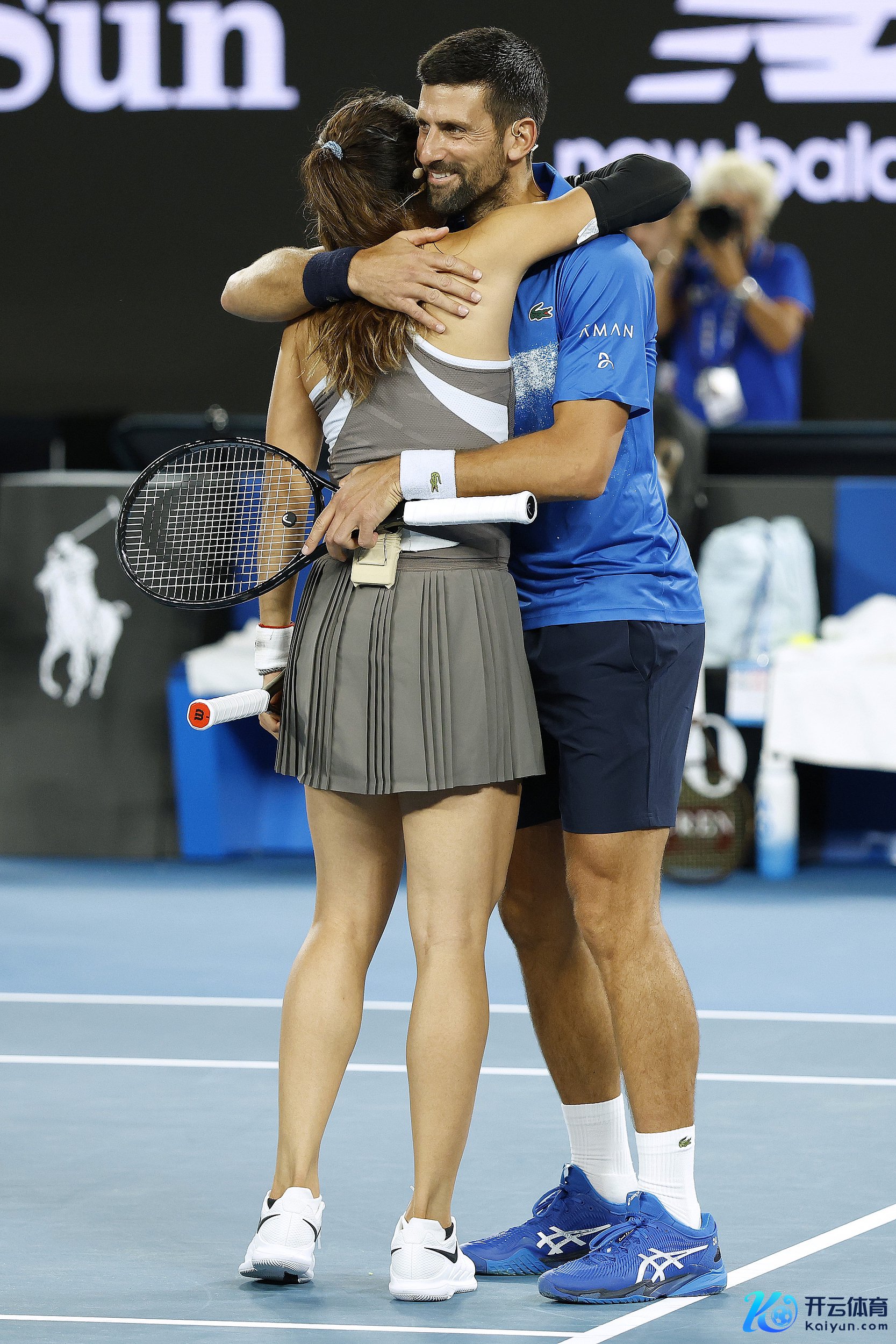 德约科维奇(右)和郑钦文拥抱庆祝。