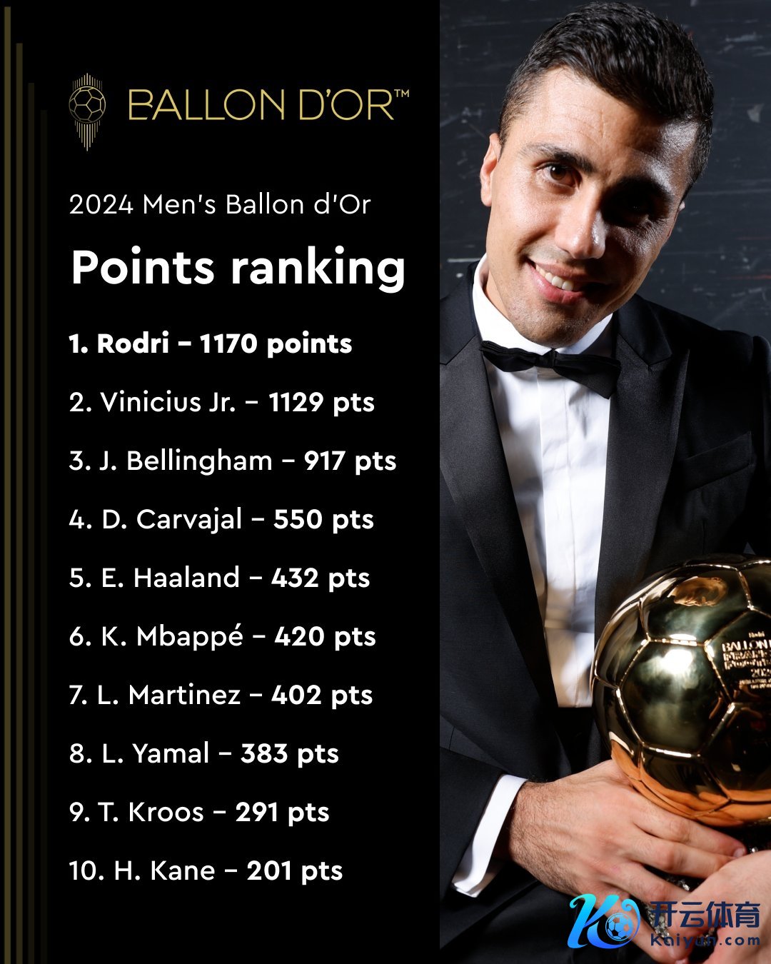 11月09日讯 金球奖、队报官方公布了2024金球奖前十名得分细目,罗德里1170分打败维尼修斯1129分,得票细目如下。