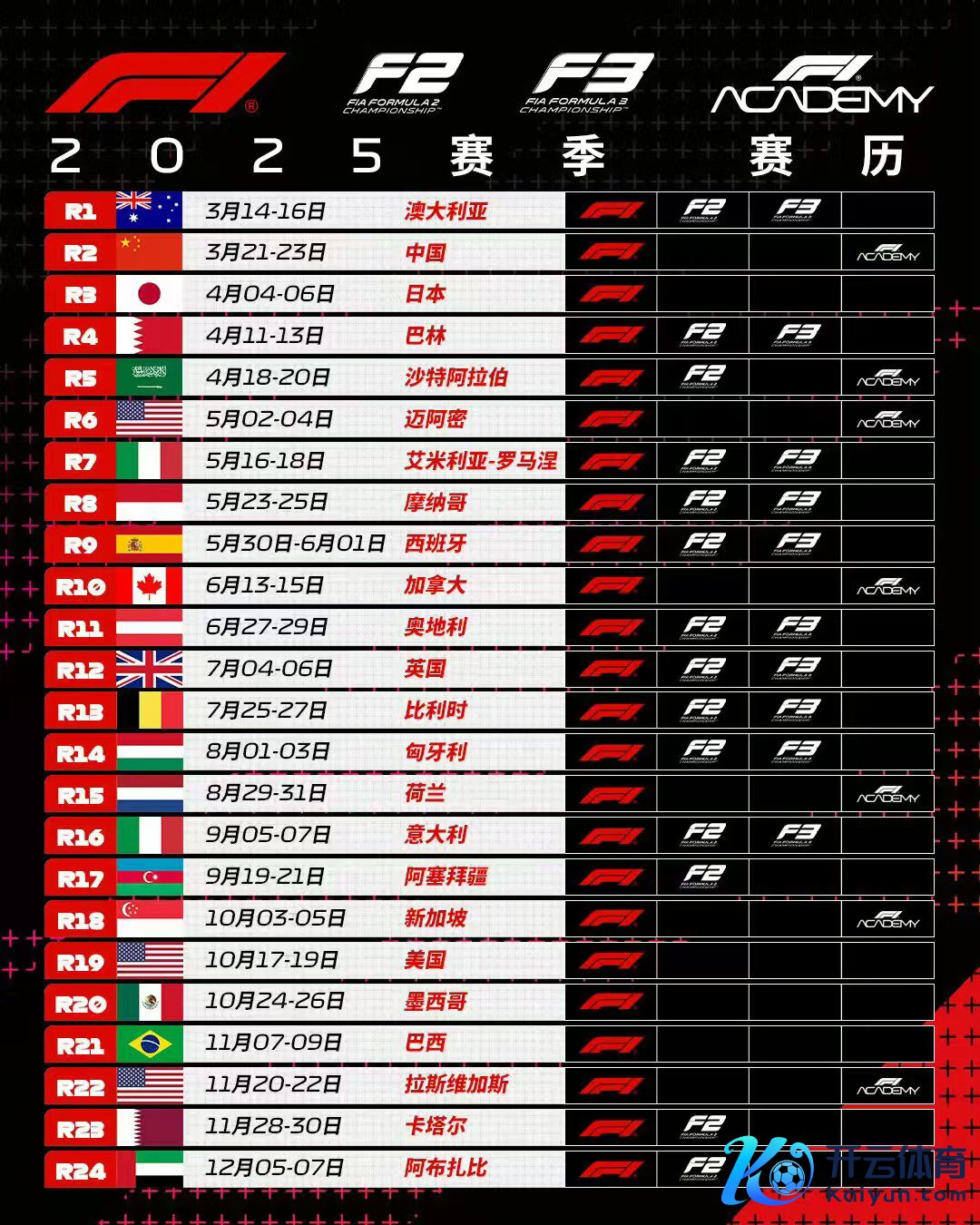 左证赛历,2025赛季F1将从2025年3月14日至16日举行的澳大利亚大奖赛开启全年24站征途,于2025年12月5日至7日举行的阿布扎比大奖赛收官。其中,2025赛季F1中国大奖赛被提前至全年第二站,时代相较本年将提前近1个月时代,安排于2025年3月21日至23日在上海海外赛车场举行。