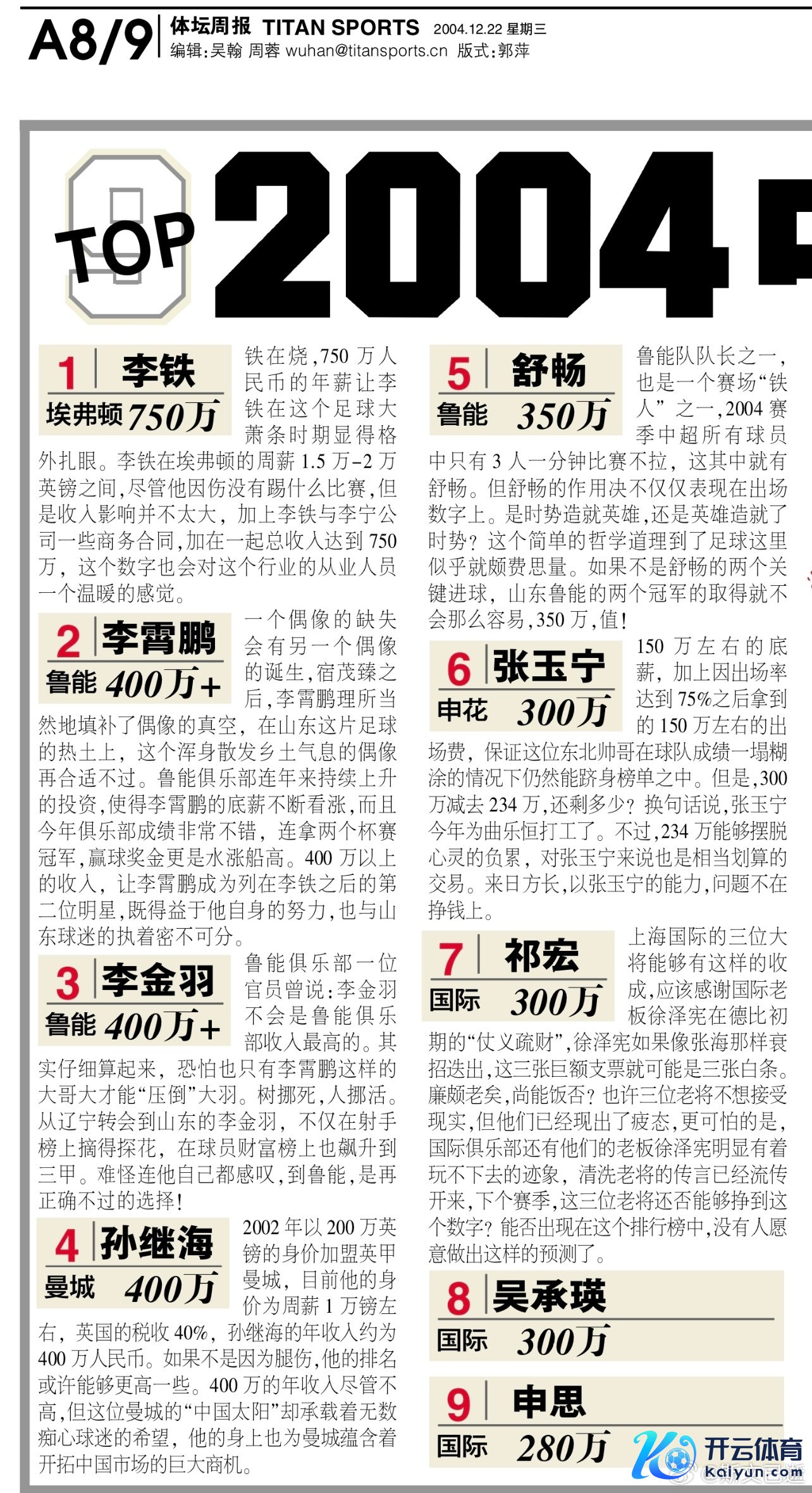 2004中国球员年收入榜:李铁750万第一,李霄鹏李金羽孙继海400万体育最新信息